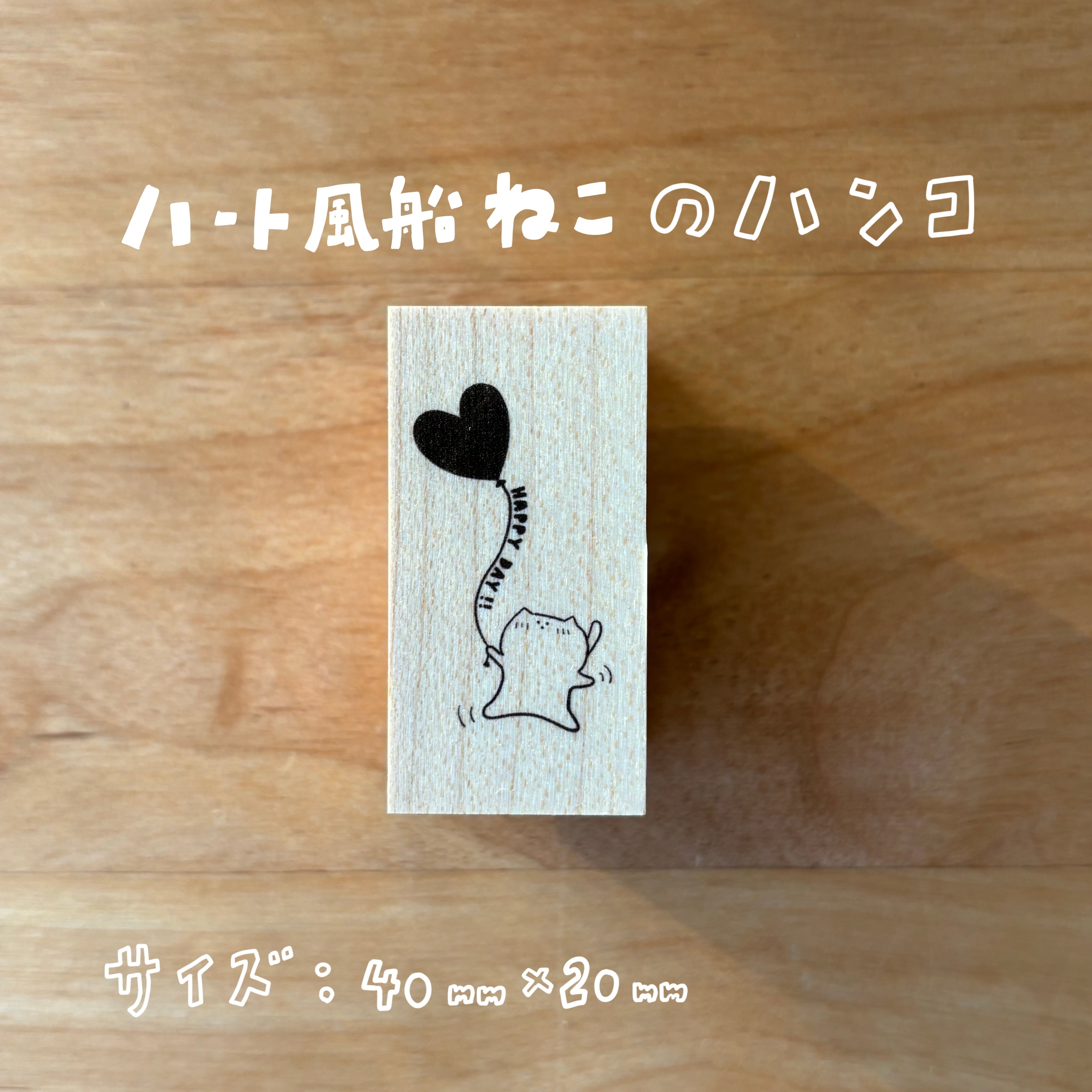 ハート風船にぶら下がるねこをハンコにしました。
