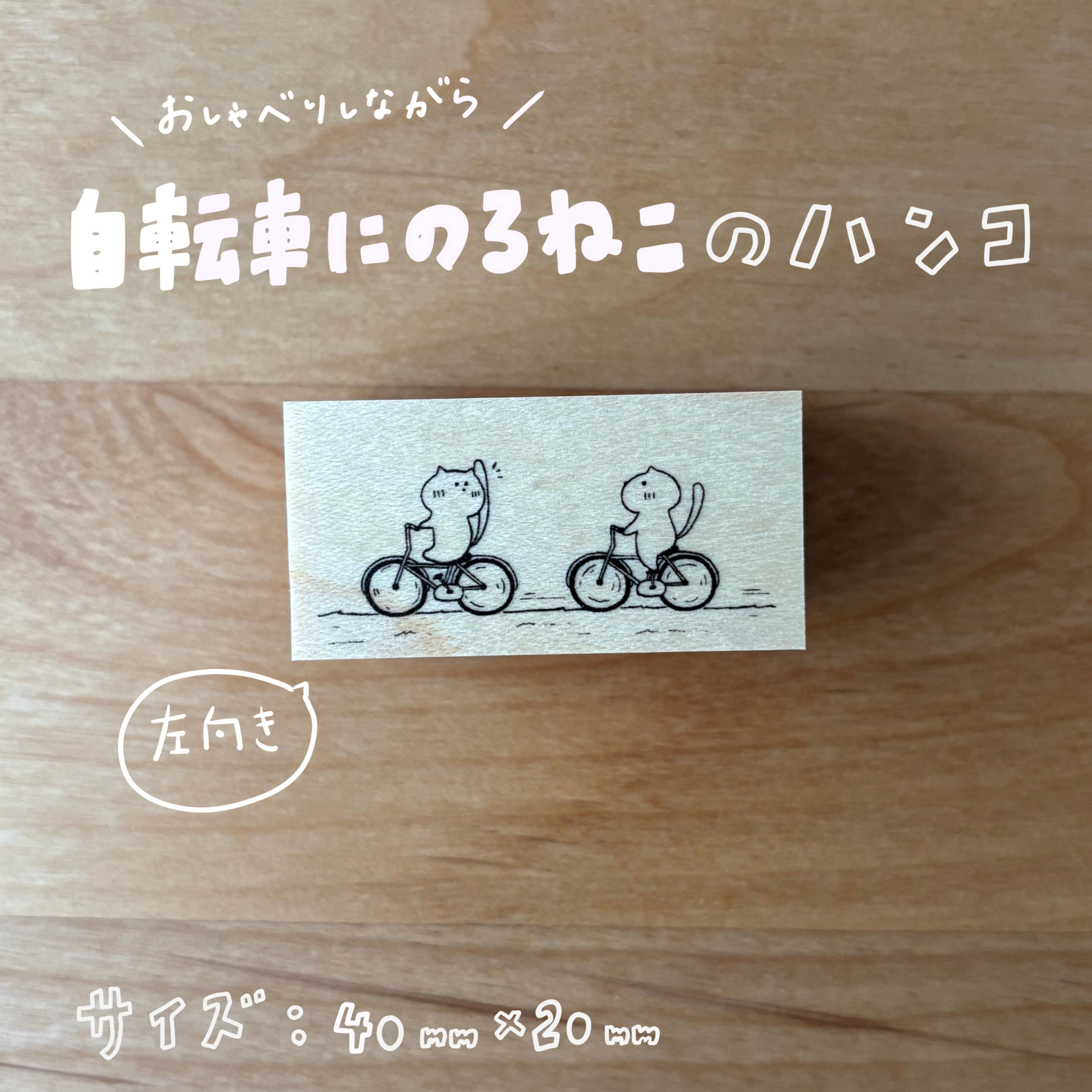2匹のねこちゃんが仲良くおしゃべりしながら自転車に乗るところをハンコにしました。