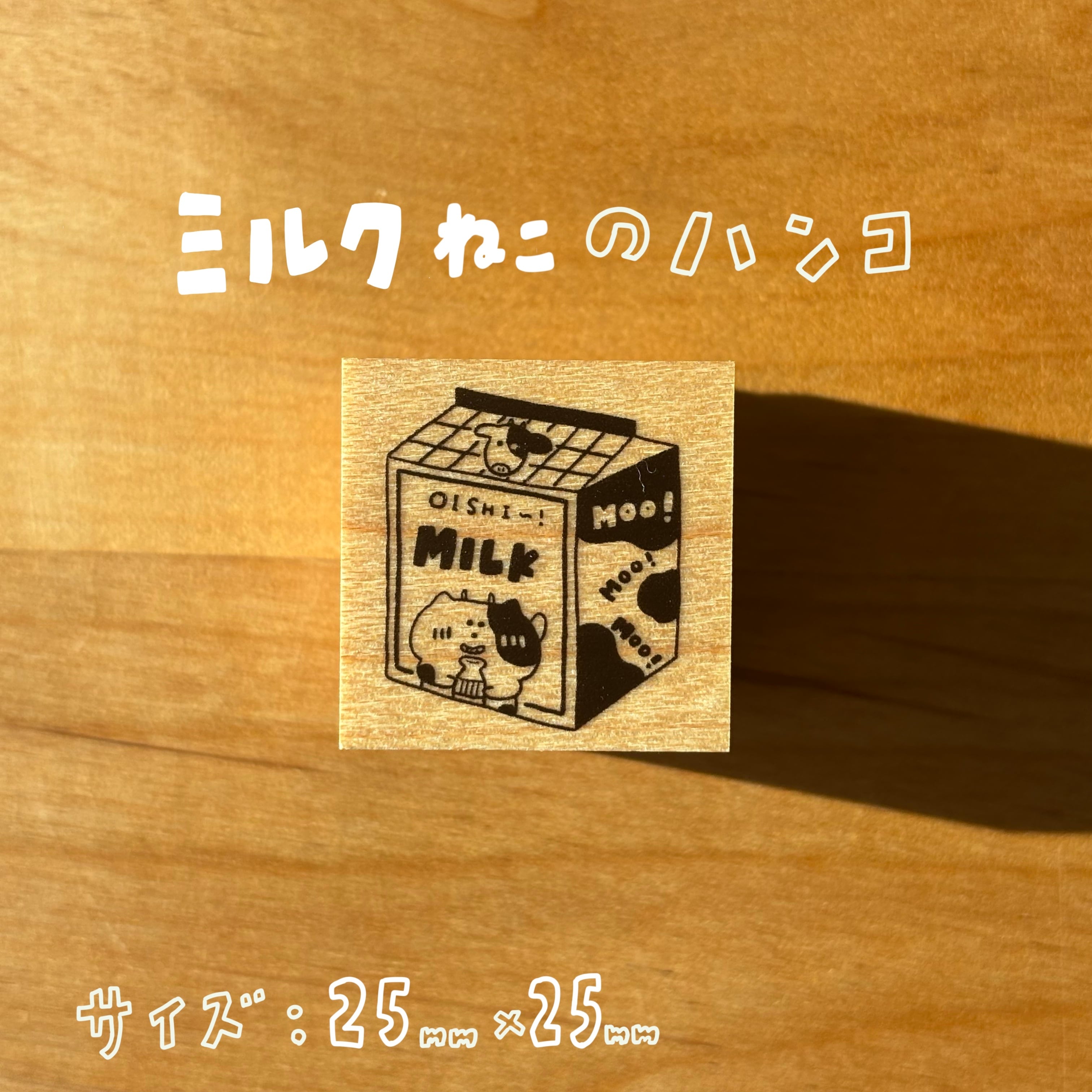 牛乳のパッケージの中でウシになっているねこのはんこです!